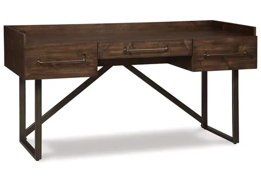 For fans of urban industrial design, the Starmore desk steals the show. Its top is crafted with a mix of acacia veneer and wood beautified with an oiled walnut-tone finish. A sleek tubular metal frame and linear, large-scale pulls pull it all together. The cutout shelf on the desk’s front side incorporates added dimension.