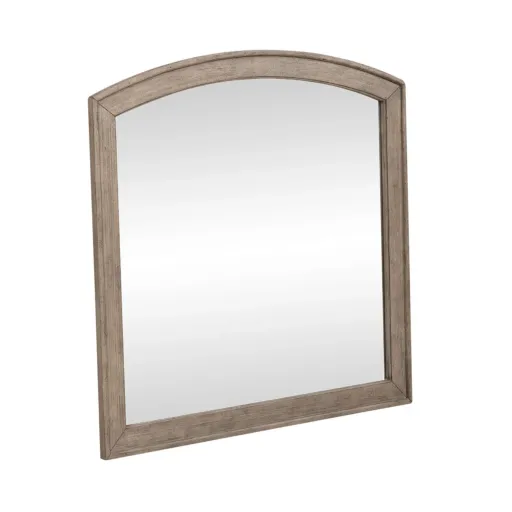 Create a calm and peaceful oasis with this arched mirror. Crafted with excellence using Rubberwood solids, this mirror features a Burnished Beige finish. The story of this mirror unfolds with its softly arched cap rail, a gentle curvature that echoed the grace of a moonlit night. This arched mirror doesn’t merely reflect its surroundings, but becomes an integral part of the rooms aesthetic narrative. The mirror boasts a one inch beveled edge. This thoughtful detail not only adds dimension to the mirror, but also enhances its reflective capabilities, creating an illusion of depth and space. This arched mirror isn’t just a functional item, but a source of luminosity that adds a sense of airiness and brightness to the space. It becomes a focal point, drawing attention with its gleaming presence. Transform your bedroom into a haven of grace and convenience with this arched mirror.