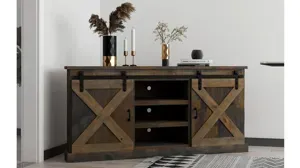 Bring "The Look" home today with the Farmhouse 66" Corner TV Console. Its wildly popular warehouse or barn style doors have become a staple in many homes across America. Reminiscent of simpler times, the appeal is understandable and undeniable. Featuring functional forged iron hardware and rolling doors.