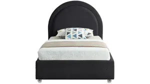 Milo Bed in rich black boucle fabric, so it's soft to the touch and regal to the eye. The star of the show is the bed's rounded headboard, which stretches out tall above you for a look that oozes regality and sophisticated charm. Acrylic legs give the bed a somewhat modern finish.