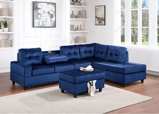 22HEIGHTS REVERSIBLE SECTIONAL STORAGE OTTOMAN - BLUE VELVET Item Number 22Heights Color Blue Material Velvet Description Reversible Sectional and Storage Ottoman Set Sold as Set Only Sleek, simple, and modern. This sectional covered in blue velvet fabric features a drop down cup holders table and a storage ottoman. Dimension RAF SOFA 78L x 34D x 34H LAF CHAISE 80L x 34D x 34H Storage Ottoman