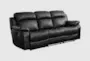 The Cameron Black 87" Reclining Sofa with Dropdown Tray offers a perfect blend of comfort and functionality, making it an ideal addition to any casual living space. Upholstered in luxurious faux leather, this sofa features a solid wood and plywood frame with a metal reinforced seat for enhanced durability. The tab pull reclining motion and drop-down center table with 2 cup holders add convenience and relaxation to your lounging experience.