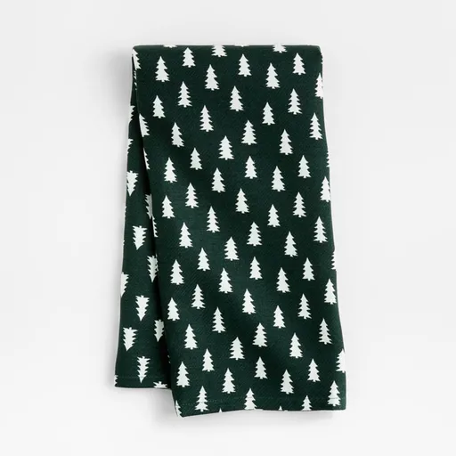 A forest worth of trees scatters this dish towel with wintry wonder. Composed of slender lines, the minimalist trees bring a fresh, modern look to winter kitchen decor. The snow-white trees are printed on the spruce green organic cotton towel in an allover pattern that pops. Use the herringbone-weave dish towel to dry dishes, hands and counters or to wrap holiday gifts.