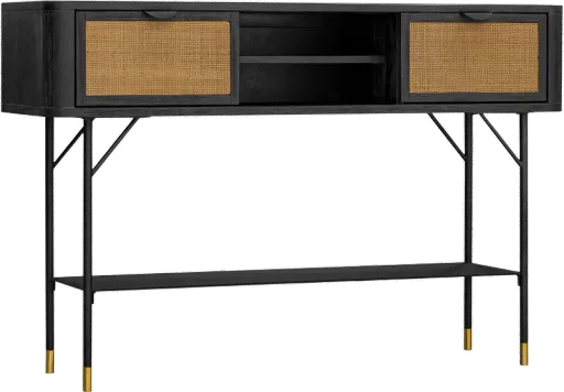 Breathe life into any dull corner of your home with this Saratoga console table. Featuring a refreshing and sophisticated mix of black Acacia and Rattan, this table maintains a modern and sculptural presence in any setting. Its sleek metallic legs are accented with brass caps to add just the right amount of glam to your home. Acacia wood is a popular choice for furniture because it has many advantages over other types of hardwood. The strength-to-weight ratio of acacia wood is one of the best in the world, making it perfect for furniture that needs to be lightweight but still durable. It is resistant to moisture and pests and does not warp. If you are looking for a durable, long-lasting material for your furniture, then acacia wood is worth considering. With two drawers and an open shelf, our console table comes in handy behind the sofa, uplifts the decor of your entryway and foyer, or serves as a storage unit in your dining room, bedroom, home office, or study. Add this console table to your home today for some extra style and storage! Available for Online Purchase Only. Ships Directly from the Manufacturer. RC Willey Delivery is Not Available. Assembly required.