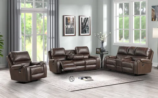 TITAN 3PCS RECLINING LIVING ROOM SET - ESPRESSO - HH Item Name Titan-Espresso Color Espresso Material Leather Gel Features Sofa Drop Down Table with Power Outlet USB Charging Ports Loveseat with Gliders and Storage Console with Power Outlet USB Charging Ports Rocker Swivel Recliner Dimensions Sofa 89 L x 40 D x 42.5 H Loveseat 78 L x 40 D x 42.5 H Recliner 41 L x 40 D x 42.5 H