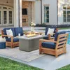 Our Teak Two 4 piece loveseat group with a fire pit from the Castello Collection has a modern look that adds both charm and convenience to your space. The seating in this group have a solid teak and fine, sanded finish for less long-term maintenance as you enjoy it for years to come. The loveseat and club chairs feature a wide-set bottom frame, creating a more elevated seating appearance. The teak used is plantation grown, European grade teak furniture from FSC-certified upcycled teak wood, gathered from old-growth, FSC-certified forests, across the Indonesian archipelago. The teak wood undergoes a six-week kiln drying process of taking moisture out of the wood. This is important because the moisture in the teak wood is what causes the finished product to shrink or expand with changes in temperature and humidity. Making it one of the most durable materials we carry, teak is the only material with a natural resistance to water, insects, mold, and mildew. Each piece is a combination of machine-made for precision and handmade with traditional Mortise and Tenon construction for smooth and tight joinery to showcase the elements from local artisans.