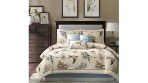 The Quincy Queen 7 Pc. Comforter Set is a casual comforter that uses warm tones of brown and blue to create a fun leaf print. The comforter features an ivory border along the edge to create a finished look. A solid blue color covers the reverse. The set also includes two standard shams and threedecorative pillows in brown, khaki, and blue that accents the colors on the comforter.
