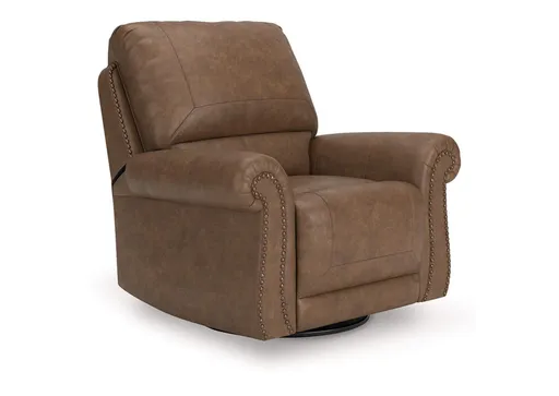 Everyone can have the best seat in the house with this swivel glider recliner. Its nailhead trim puts the finishing touches on the traditional roll arms you love. The recliner's comfy, durable cushions—wrapped in a rustic yet sophisticated faux leather—keep you feeling relaxed, while its turned legs show that style and quality flow from top to bottom. Plus the smooth reclining motion and 360-degree swivel keep you in the flow of conversation.