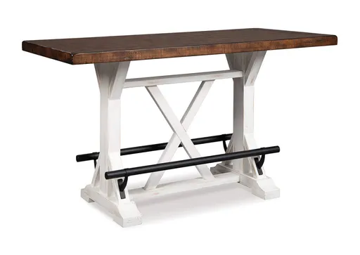 A high-style choice for smaller spaces, the Valebeck counter height dining table serves up the best in rustic farmhouse living. Its two-tone finish pairs a brown tabletop with a distressed vintage white base for a double helping of charm. Black metal foot rests add such a distinctive twist.