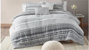 Give your bedroom a soft casual update with the Calum 5-pc. Comforter Set. The cotton clipped comforter features yarn-dyed stripes of tonal grey and off-white, for a soft and alluring look. Matching shams (1 for Twin Sizes) mirror the design seen on top of the bed, while two decorative pillows add the finishing touches to the bed. Hypoallergenic polyester filling in the comforter and pillows provides exceptional warmth and comfort. Easy to coordinate with, this cotton comforter set brings a rich textural look and feel to your bedroom decor and is machine washable for easy care.