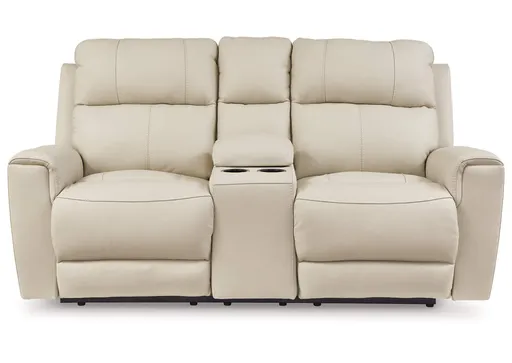 Focus on function. The practical Dahlmoore power reclining loveseat with console balances contemporary character and irresistible comfort. Its affordable, expertly matched leather and faux leather upholstery keeps your style up to speed without breaking the bank. Reclining at the touch of a button, this loveseat plays well in relaxed, luxe seating areas made for quality time.