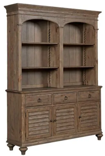 Together, the Hastings Buffet and Open Hutch are the statement piece in this solid wood dining room. The Hastings not only shares its style with farmhouse dining rooms of the past, it also utilizes the nearly forgotten sawtooth feature to adjust the shelve