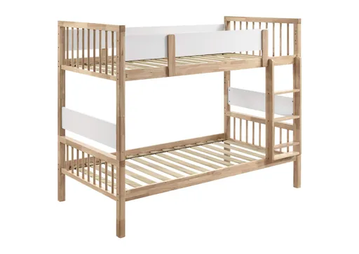 This versatile twin-over-twin bunk bed easily adapts to your familys needs with five unique configurations, including a bunk bed, kids\' loft with a twin bed, daybed with a twin bed, toddler bed with a twin bed, or two separate twin beds. Crafted from solid rubberwood, plywood, and MDF, its designed for durability and functionality. The combination of natural wood tones and crisp white accents offers a modern, stylish aesthetic. Perfect for maximizing space in smaller bedrooms or multifunctional areas.