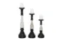 Enhance your home decor with this Black Wood Candle Holder Set of 3. These candle holders feature a farmhouse style that adds a rustic charm to any room. Made from a combination of aluminium and swietenea mahogany, they are both durable and stylish.