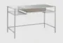 The Sadelle Writing Desk features an antique silver finish and a tempered glass top, perfect for any rustic office space. This desk is made of MDF, wood veneer, metal, and tempered glass with a stone wood finish and antique brushed silver metal legs. Assembly is required and the drawers glide smoothly on wooden glides.