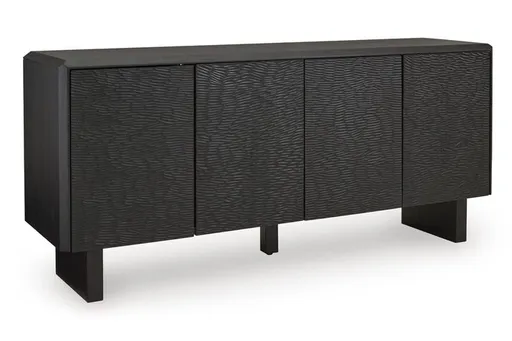 The Farrelmore Accent Cabinetis the ideal combination of design and function Thissolidwood pieceincorporates a black finish and displaysa fantastic representation of modern fresh design Its carved pattern doors open to reveal interiorshelves for storing seasonal decor entertainment accessories or office essentials