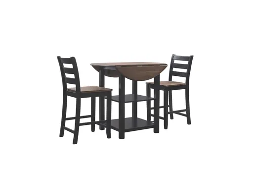 The Vail Black + Brown Two Tone Round Drop Leaf Counter Height Set for 2 is a perfect blend of traditional and farmhouse styles. This elegant set features a round to square table design, making it versatile for any dining space. Crafted from a mix of rubberwood, MDF, and acacia wood, it offers both durability and a rustic charm.