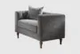 The Sidonia Grey Fabric Wood Bench Seat Arm Chair with Nailheads is a stunning addition to any living room. This traditional club chair features a sophisticated spindle design with a comfortable bench seat. The grey velvet fabric, combined with the solid wood frame, adds a timeless touch to your home decor.