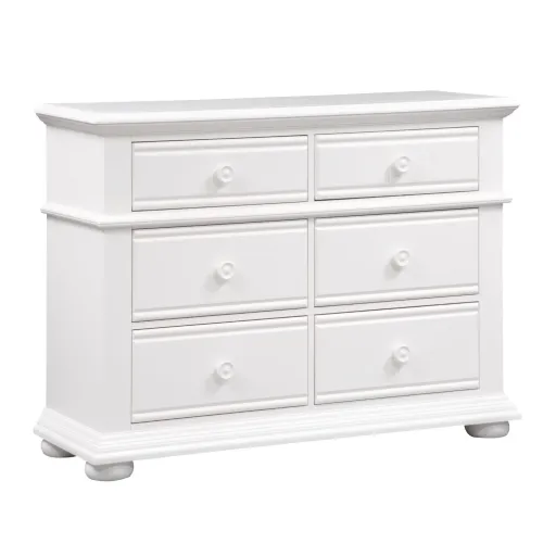 Obtain a fashionable cottage look with the Summer House 6 drawer dresser. Crafted of pine solids with painted MDF, this piece features bottom case dust proofing, full extension drawer glides for easy access to storage, fully stained interior drawers, felt lined top drawers, and is accented by wooden knob hardware.