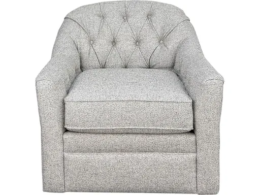 The Adalie swivel glider is barrel shaped with sloping arms and button tuft details and is featured in the Natural Beauty Cloud fabric.