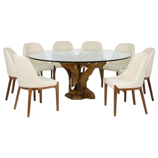 Designed to be the heart of your home, the 72" Sumatra/Marbella 9-Piece Dining Set offers generous seating and standout style. The table features a natural teak root base paired with a spacious round top that seats up to eight, combining practicality with eye-catching sculptural detail. The coordinating chairs enhance the look with tapered wooden legs and supportive curved backs, delivering comfort and balance to the design. With its blend of organic texture and modern lines, this set makes a bold, beautiful statement in any dining space.