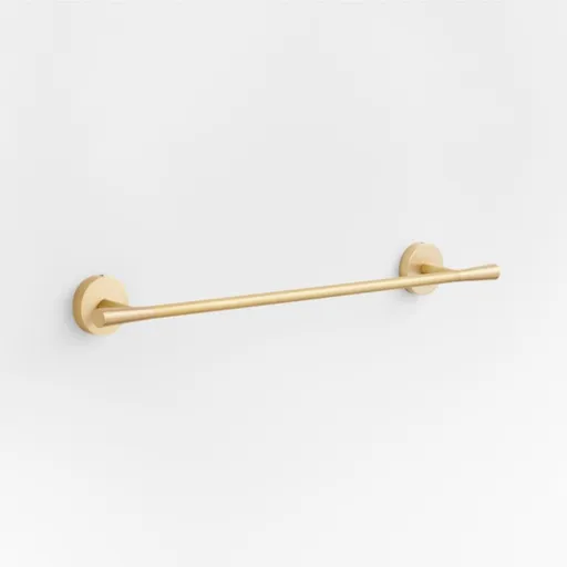 Sometimes it's the small things that pull a room together. That's why we've designed a hardware collection with modern silhouettes, clean lines and a touch of tradition to give your bathroom that perfect finishing touch. Made of brass with a brushed finish, the stylish towel bar caps the hanging rod with subtly tapered finials. Cylindrical posts anchored with scaled-up round rosette bases provide a graphic look with modern proportions. Also available in a longer length, the 18-inch towel bar is ready to be wall mounted with included hardware.