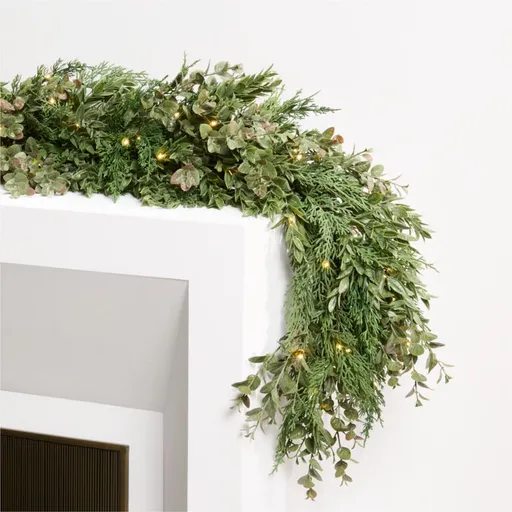Our pre-lit garland graces the home with the lifelike greenery. Skillfully crafted to look just like real botanicals, the lush swag replicates the lacy look of cedar boughs interspersed with glossy boxwood sprigs. Lit with warm white LED lights, the battery-operated garland looks lovely on a mantel, draped on a banister or running the length of a dining room table.