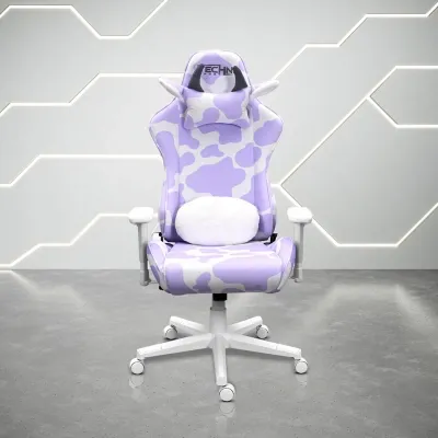 Tell the other gaming chairs to "MOO-ve" out the way because our TS85 Lavender Print Cow Series Gaming Chair is exactly what you need to stand out. It has smooth, velvet-like upholstery, a high-quality memory foam seat, a cow neck pillow with white plush ears and grey horns, plus a double-sided lumbar pillow! Providing the ultimate comfort, style, and performance, this gaming chair also features 2D adjustable armrests, pneumatic seat height adjustment, up to a 150-degree reclining mechanism, durable white nylon base and casters, and much more! This chair can support weights up to 300 lbs. and comes with a 2-year limited warranty.