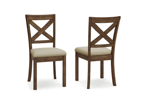 Moriville upholstered dining chair elevates the art of casual rustic style. With a distressed nutmeg finish, antiqued nailhead trim and textured polyester fabric, this upholstered dining chair with classic X back styling entices with warmth and earthy elegance. Cushioned seat accommodates lingering meals enjoyed in comfort.