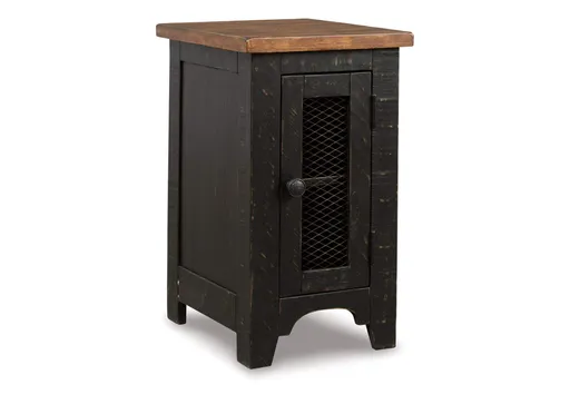 To those with an eye for the best in rustic farmhouse living, the two-tone Valebeck chairside end table doubles up on charm. Designer touches include plank-effect styling, distress marks and a wire mesh door front for added character.