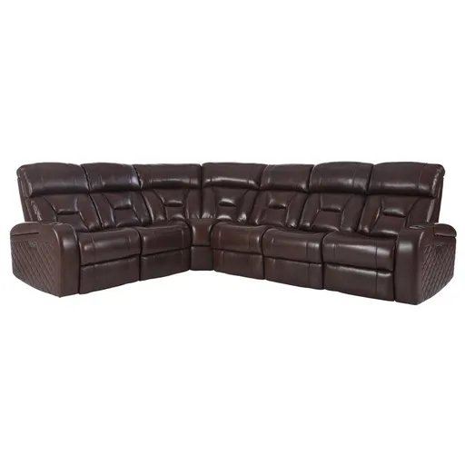Say "hello" to the ultimate couch experience. The Gio Brown Leather Power Reclining Sectional boasts three recliners, power headrests, a drop-down table with lights, LED lighting, built-in USB ports, and so much more. Cupholders and storage make it even more functional, and deep, wide seating gives it the perfect level of comfort.