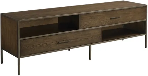 Cleo uses mixed materials of layered clear and smoke glass in a metal framework to add dimension and interest. The bottom shelf uses oak veneers in a deep brown wood finish. The metal is comprised of a dusky silver finish, for an overall look that evokes rich woodsy tones.