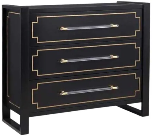 The Lowery hall chest exudes modern elegance, combining a sleek black lacquer finish with refined gold trim that outlines the drawers. The acrylic and gold bar hardware adds a touch of luxury, making this piece a striking addition to any room.
