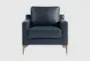 The Fletcher Navy Blue Faux Leather Arm Chair combines casual style with modern elegance, making it a perfect addition to any living space. Upholstered in rich navy blue faux leather, this chair features modern bronze metal legs and a sturdy solid wood frame. The pocket coils and high-density foam seating ensure maximum comfort and support. This design is the perfect bedroom chair, reading chair, club chair or accent chair for living room.