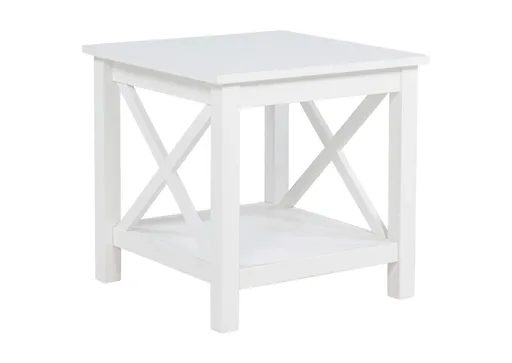 Clean lines and a classic silhouette define this square end table, bringing crisp charm and simple function to any space. An X-frame base adds a touch of farmhouse character, while the open lower shelf offers easy storage or display. Finished in bright white and crafted from solid pine and engineered wood, this accent table adds fresh energy and reliable structure to living rooms or reading corners.