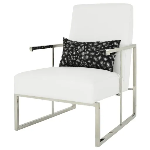 Enhance the style of your contemporary home with the Baldo White Accent Chair, with its curved back, patterned accent pillow, and stainless steel frame. With clean white leatherette that’s soft to the touch and foam padding, this accent chair ensures you’re comfortable as soon as you take a seat and cuddle up with a book.