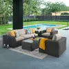 The Laguna Collection is a casual contemporary outdoor patio collection with a tightly woven, wicker design, for a transitional look that won't go out of style. Each piece in this 4 piece sofa group are comprised of handwoven, large synthetic strands of resin wicker over a powder-coated aluminum frame. The sofa and club chairs feature wide, straight arms and textilene seat suspension. The textilene material's flexibility and sturdiness make it a comfortable material for seating. The coffee table features a wide, woven frame and a glass top for a smooth top.