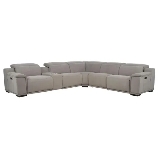 The Naivis Power Reclining Sectional with 6PCS/2PWR was built to impress with its power motion, built-in USB-A ports, and storage console with beverage holder. Its block-style legs, contemporary style and gray microsuede fabric only add to its modern appeal, making it the perfect choice for your living room.