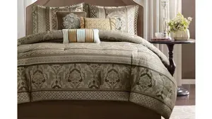 To add a touch of richness to your current d_cor, the Bellagio Cal King 7 Pc. Comforter Set offers a luxurious update to your room. Made from polyester, the comforter and shams share leaf, striping and ironwork motifs that are accentuated by elegant stitching. Pops of gold are also used throughout this collection adding a lavish feeling to your decor. Three decorative pillows feature pleating and embroidery details that correspond back to the comforter, while a rich bedskirt helps bring the entire look together.