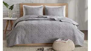 The Caden Full/Queen 3 Pc. Coverlet Set adds a charming touch to your bedroom decor. This quilted coverlet features a solid grey front and back with a geometric pattern. Matching shams reiterate the design of the coverlet, completing the casual look. The quilted coverlet is made from 100% cotton and is machine washable to make cleaning a breeze. Great for summer use or layer it on for cold weather.