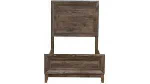 Enhance any room with this urban Ridgecrest Twin Panel Bed. Crafted by Rubberwood solids and Paper Laminate, this bed features a Cobblestone finish, hook on rails, and a center support slat system, all anchored by crafted tapered legs. This bed offers an effortless blend of materials with distressed finishes, making it extremely versatile and adaptable to any space.