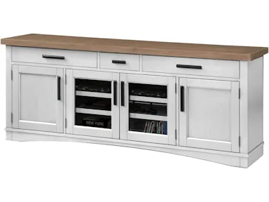 Give your living area and instant refresh with the addition of the Americana Modern 76-inch TV Console with Power Center. A tastefully designed media option, it features closed storage, glass doors for media components, and a fresh cotton white finish accented with a contrasting wood-grain top and metal hardware. With a nod to early craftsman design and today's popular farmhouse aesthetic, Americana Modern is the essence of timeless style.