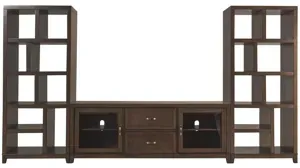 Divide and conquer with the Granthom 3-pc. wall unit crafted of solid poplar with birch veneers. The 72" TV console and pair of open towers enable you to customize your entertainment space. Wood-framed glass doors and see-through compartments add to the visual transparency of this flexible wall unit.