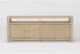 The Voyage Natural 80" Modern TV Stand by Nate Berkus + Jeremiah Brent is the perfect addition to any living room, combining functionality with a sleek design. Crafted from knotty white oak veneer and solid hardwood, this entertainment center offers ample storage with its doors and shelves. Its sun-drenched oak finish adds a touch of warmth and natural beauty to your space.