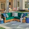 Our Teak Two 5 piece sectional with cushions from the Castello deep seating collection has a modern look that adds both charm and convenience to your space. Each item in this group is solid teak and has a fine, sanded finish for less long-term maintenance as you enjoy it for years to come. The back frame of each sectional piece consists of horizontal slats and the arms of the club chairs are constructed in a boxy manner. In addition, the seating contains a wide-set bottom frame, creating a more elevated seating appearance. The teak used is plantation grown, European grade teak furniture from FSC-certified upcycled teak wood, gathered from old-growth, FSC-certified forests, across the Indonesian archipelago. The teak wood undergoes a six-week kiln drying process of taking moisture out of the wood. This is important because the moisture in the teak wood is what causes the finished product to shrink or expand with changes in temperature and humidity. Making it one of the most durable materials we carry, teak is the only material with a natural resistance to water, insects, mold, and mildew. Each piece is a combination of machine-made for precision and handmade with traditional Mortise and Tenon construction for smooth and tight joinery to showcase the elements from local artisans.