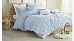 The Brooklyn 7-piece full/queen comforter set brings a soft and charming update to your bedroom. The blue cotton comforter features small tufted chenille dots that create a fresh shabby chic look. Matching shams and quilted Euro shams complement the cotton jacquard comforter set. Two Decorative pillows are also included, adding the finishing touches. This bedding set is also OEKO-TEX certified, meaning it does not contain any harmful substances or chemicals to ensure quality comfort and wellness.