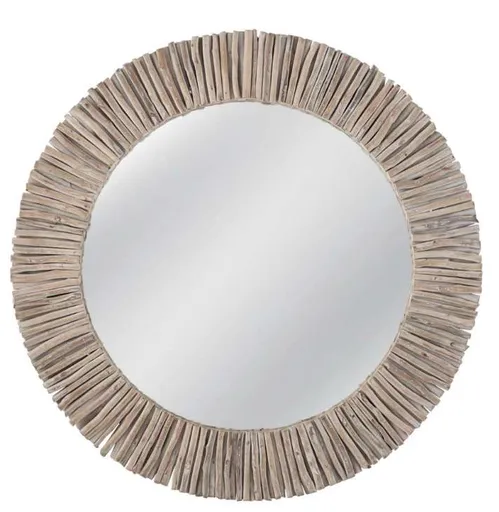 Splay Wall Mirror is a round decorative wall mirror made of eucalyptus reeds. The face is a wood finish and the sides feature a white wash finish. Elevate your wall with this eye-catching piece.