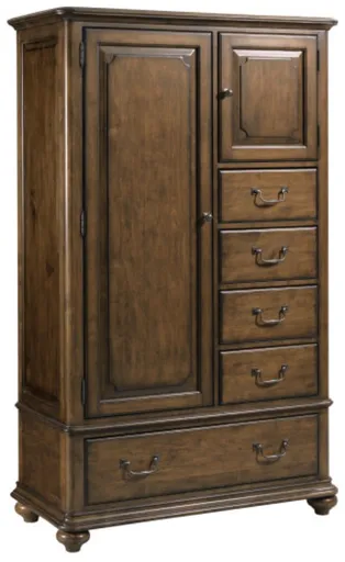 A statement bedroom piece in the Commonwealth solid wood furniture collection, the Witham Gentlemen's Chest features five drawers and two doors in an asymmetrical layout. Behind the tall door there are three adjustable shelves while the smaller right-side-facing door houses one adjustable shelf. This piece adds interest and center-piece type scale to the bedroom.