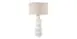 Small pieces of natural white rice stone and glass are meticulously hand cast into this timeless scalloped lamp base. The tan linen shade and antique brass fittings add a warm contrast to the lamp. Topped with matching natural rice stone ball finial.
