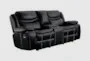 Experience ultimate comfort and style with the Forte Black Glider Reclining Console Loveseat. This casual yet sophisticated loveseat is upholstered in premium faux leather, offering a sleek black finish that complements any living space. Designed with a solid wood and plywood frame, it features a metal reinforced seat for enhanced durability. The loveseat's gentle gliding motion and tab pull reclining mechanism ensure relaxation at its finest, while the center storage console with two cup holders adds a touch of convenience.